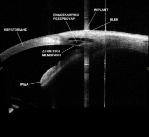Εικόνα 2: OCT τομογραφία προσθίου ημιμορίου οφθαλμού ασθενούς που υποβλήθηκε σε επέμβαση εν τω βάθει σκληρεκτομής (εικόνα από το προσωπικό μας αρχείο επεμβάσεων).